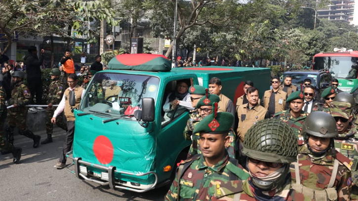 গাড়িবহরে লাল সবুজ রঙের বাসটিও রয়েছে। তারেক রহমান, তার স্ত্রী জুবাইদা রহমান, কন্যা জাইমা রহমান, ছোট ভাই আরাফাত রহমান কোকোর স্ত্রীসহ পরিবারের সদস্যরা জানাজাস্থলে যাচ্ছেন।